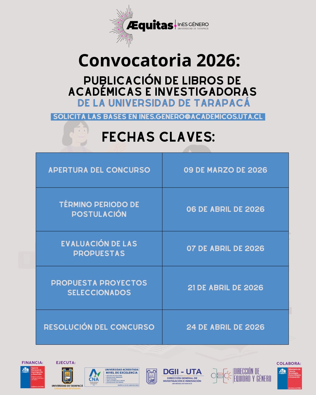 El presente concurso se enmarca en los objetivos del Proyecto AEquitas InES Género INGE 220010, orientado a reducir brechas de género en I+D+i, particularmente aquellas asociadas a la productividad académica, visibilidad, liderazgo y posicionamiento de las académicas e investigadoras de la Universidad de Tarapacá. En este contexto, la publicación de libros académicos constituye un mecanismo relevante de reconocimiento y consolidación de trayectorias académicas, especialmente en disciplinas donde este tipo de productos tiene alto valor. Este fondo por tanto, busca contribuir al fortalecimiento de la carrera académica de mujeres, promoviendo publicaciones de alta calidad académica que integren de manera sustantiva o contextual, la perspectiva de género y/o aporten al debate disciplinar desde un enfoque inclusivo.